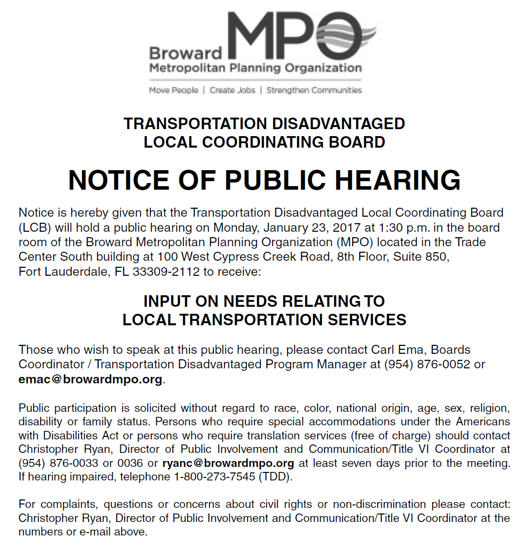 Transportation Disadvantaged Local Coordinating Board (LCB) From January 23, 2017 1:30 pm until January 23, 2017 3:30 pm At Broward MPO Office - Board Room LCB Ad Link Share this page